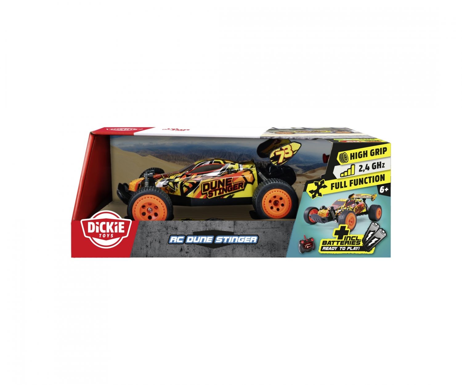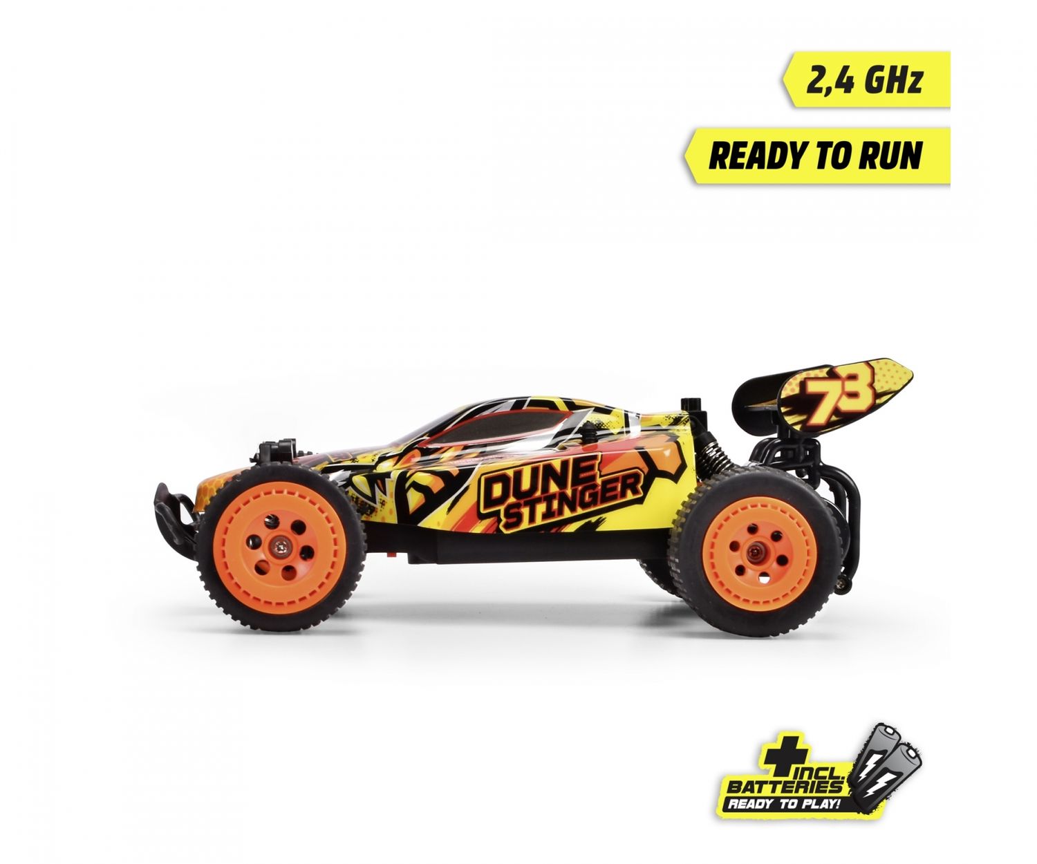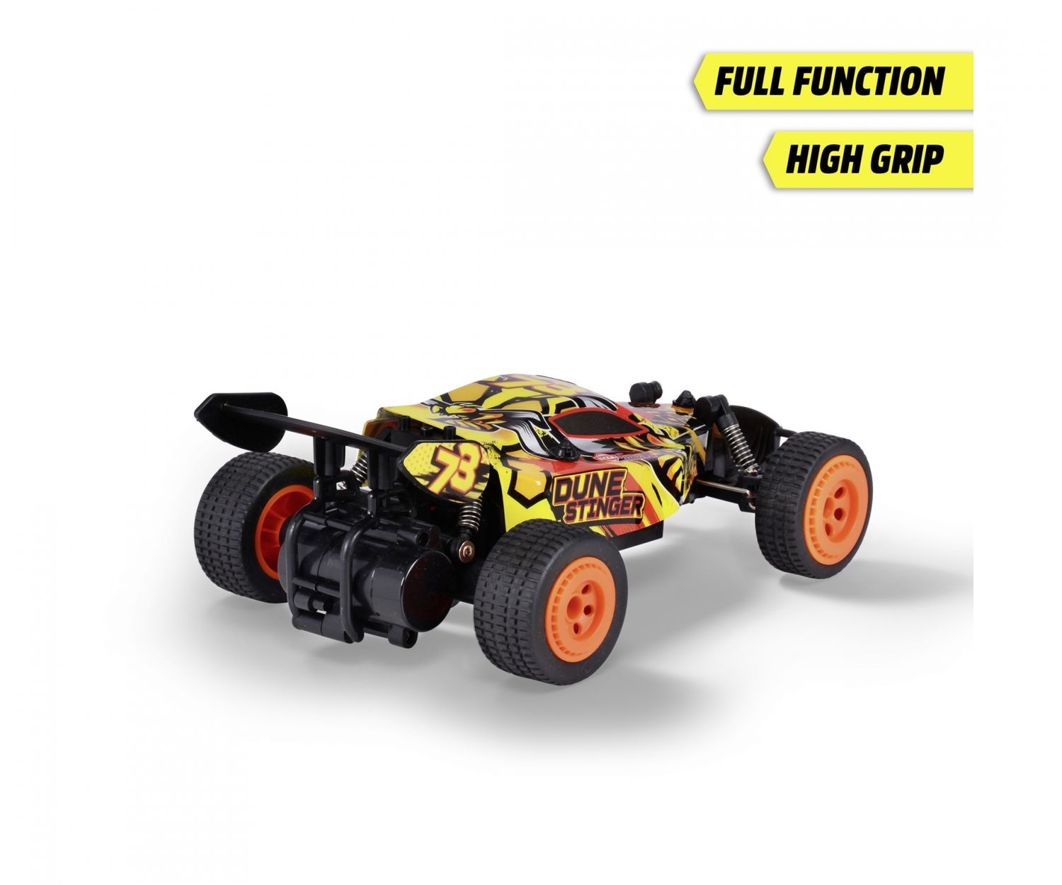 Der RC Dune Stinger RTR ist ein robustes, sofort fahrbereites Ferngesteuertes Modellauto im Maßstab 1:24. Mit seiner geländetauglichen Gestaltung, Federung und griffigen Gummireifen bietet er ab 6 Jahren actionreiche Spielmomente – drinnen wie draußen.
