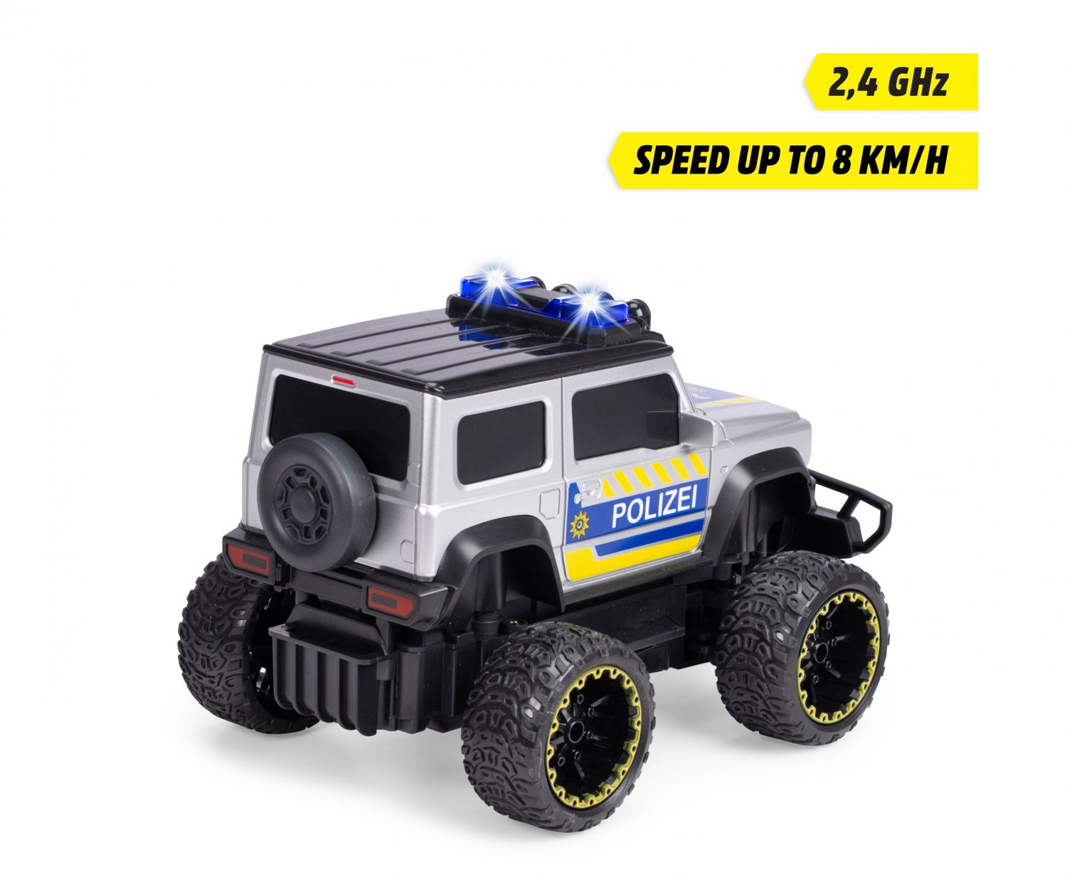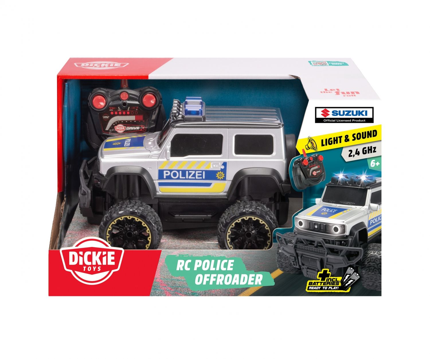 Mit Blaulicht und Sirene starten die Nachwuchs-Cops ihre Patrouille – oder eine actionreiche Verbrecherjagd! Das coole Polizeiauto mit Licht und Sound kombiniert die robuste Offroad-Performance des Suzuki Jimny Geländewagens mit deutschem Polizei-Design! Dank der kinderleichten Fernsteuerung in alle Richtungen behalten die Polizistinnen und Polizisten ab 3 Jahren die volle Kontrolle über das RC Spielzeugauto – und ihre Umgebung! Alle benötigten Batterien für das Einsatzfahrzeug und die Fernbedienung werden mitgeliefert.