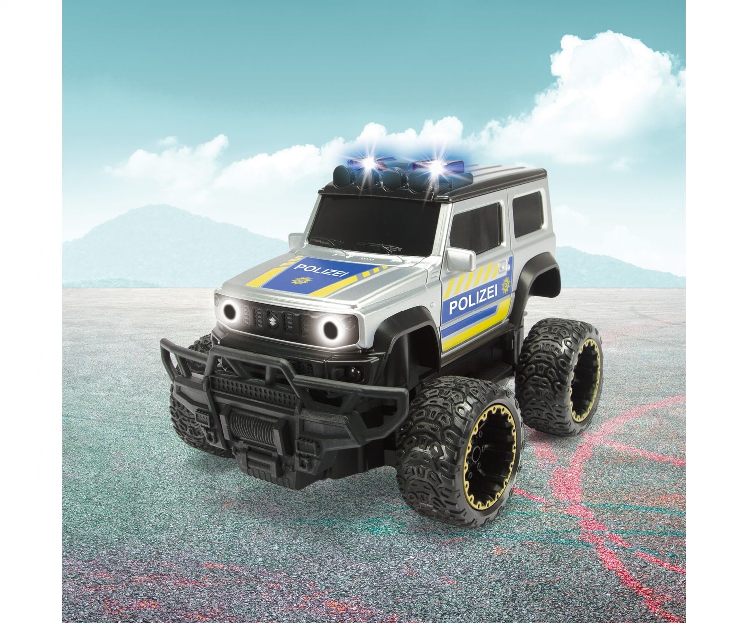 •RC Polizei-Auto - Dicke Reifen, robuste SUV-Ausstattung und eine imposante Größe: Mit diesem lizenzierten Suzuki Jimny Geländewagen stehen ab sofort wilde Verfolgungsjagden auf der Tagesordnung!
