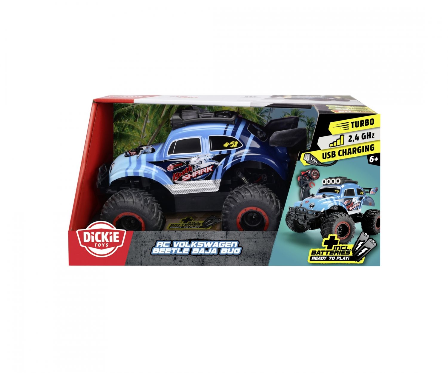 Der ferngesteuerte Volkswagen Beetle Baja Bug RTR von Dickie Toys vereint kultige Offroad- Optik mit moderner Technik. Lizenzierte VW-Karosserie, robuste Monstertruck-Reifen und LED-Scheinwerfer auf dem Dach bieten tollen Spielspaß für Kinder ab 6 Jahren – drinnen wie draußen.