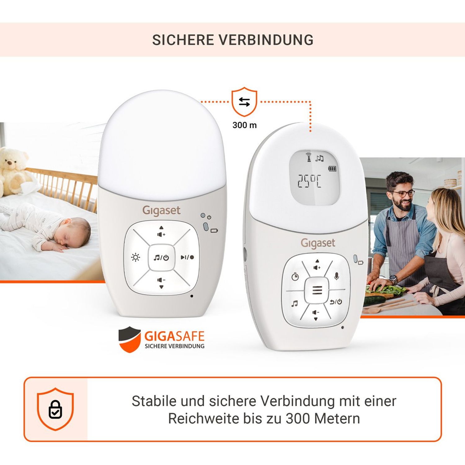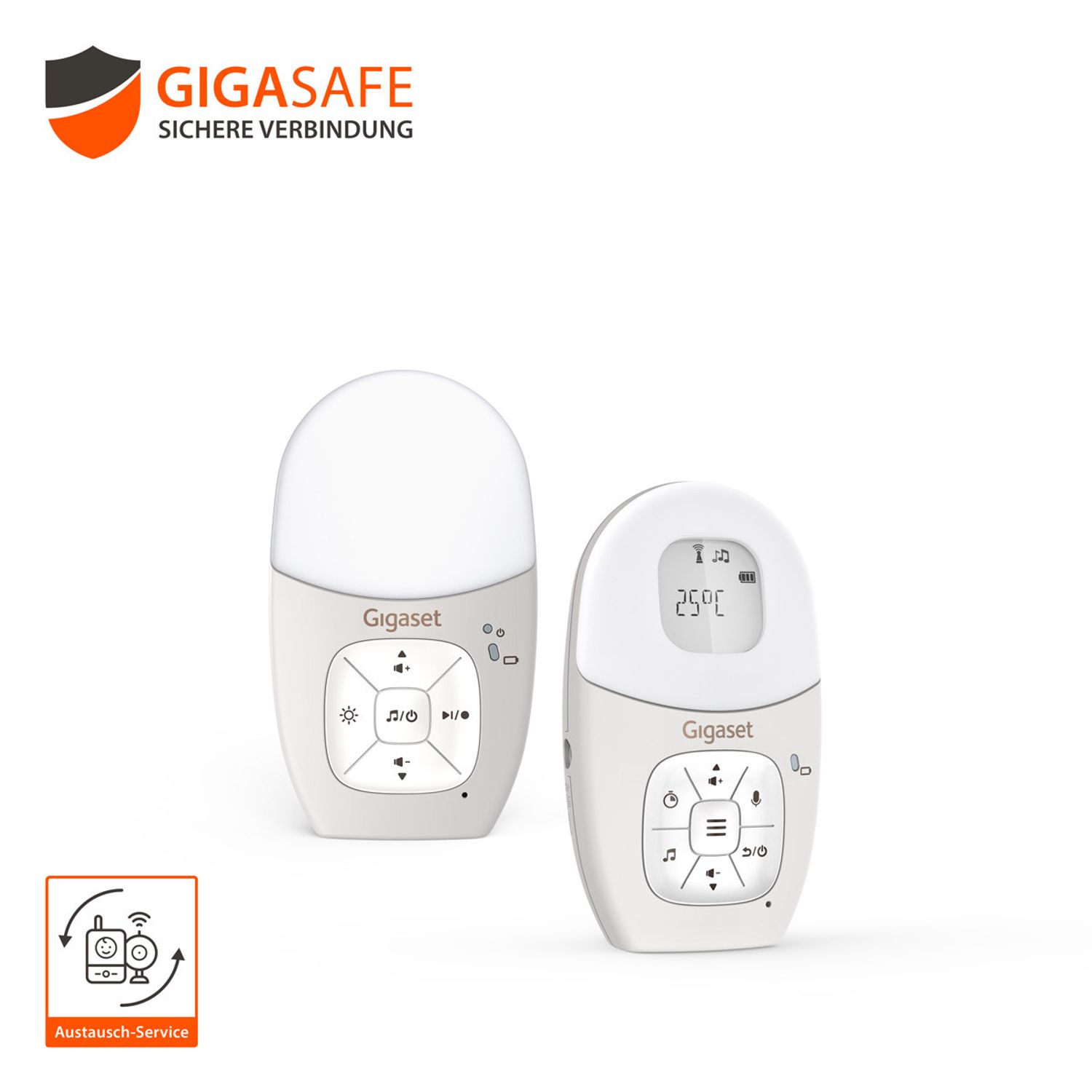 Das Gigaset Baby 100 Audio sorgt für Ruhe, Sicherheit und Gelassenheit im Alltag junger Eltern. Mit seiner klaren Tonübertragung, der hohen Reichweite und vielen durchdachten Zusatzfunktionen begleitet es dich zuverlässig durch den Tag und die Nacht. So hast du dein Baby immer im Ohr, auch wenn du dich gerade in einem anderen Raum befindest.