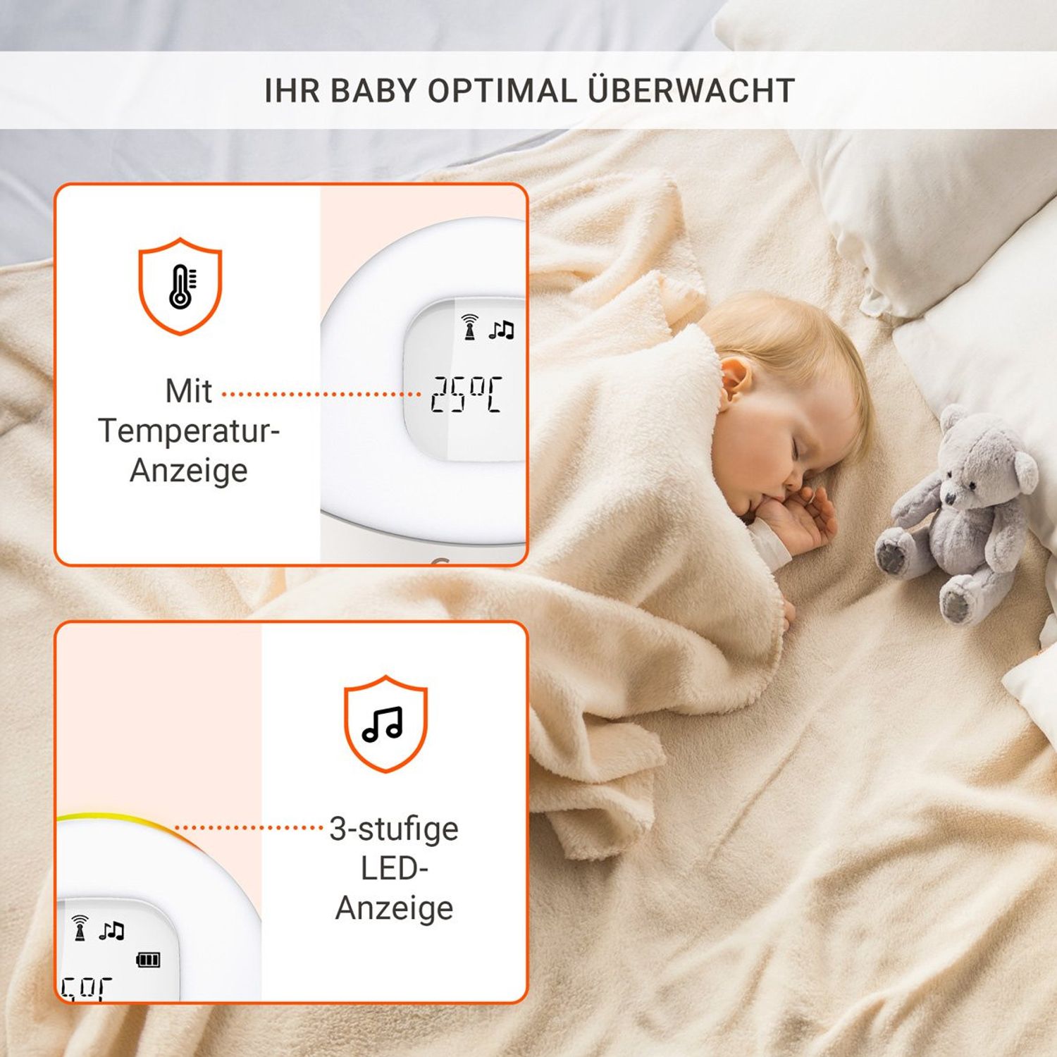 • Funktionen: Zwei-Wege-Kommunikation, Temperaturanzeige, Nachtlicht, Einschlaflieder, Fütter-Timer