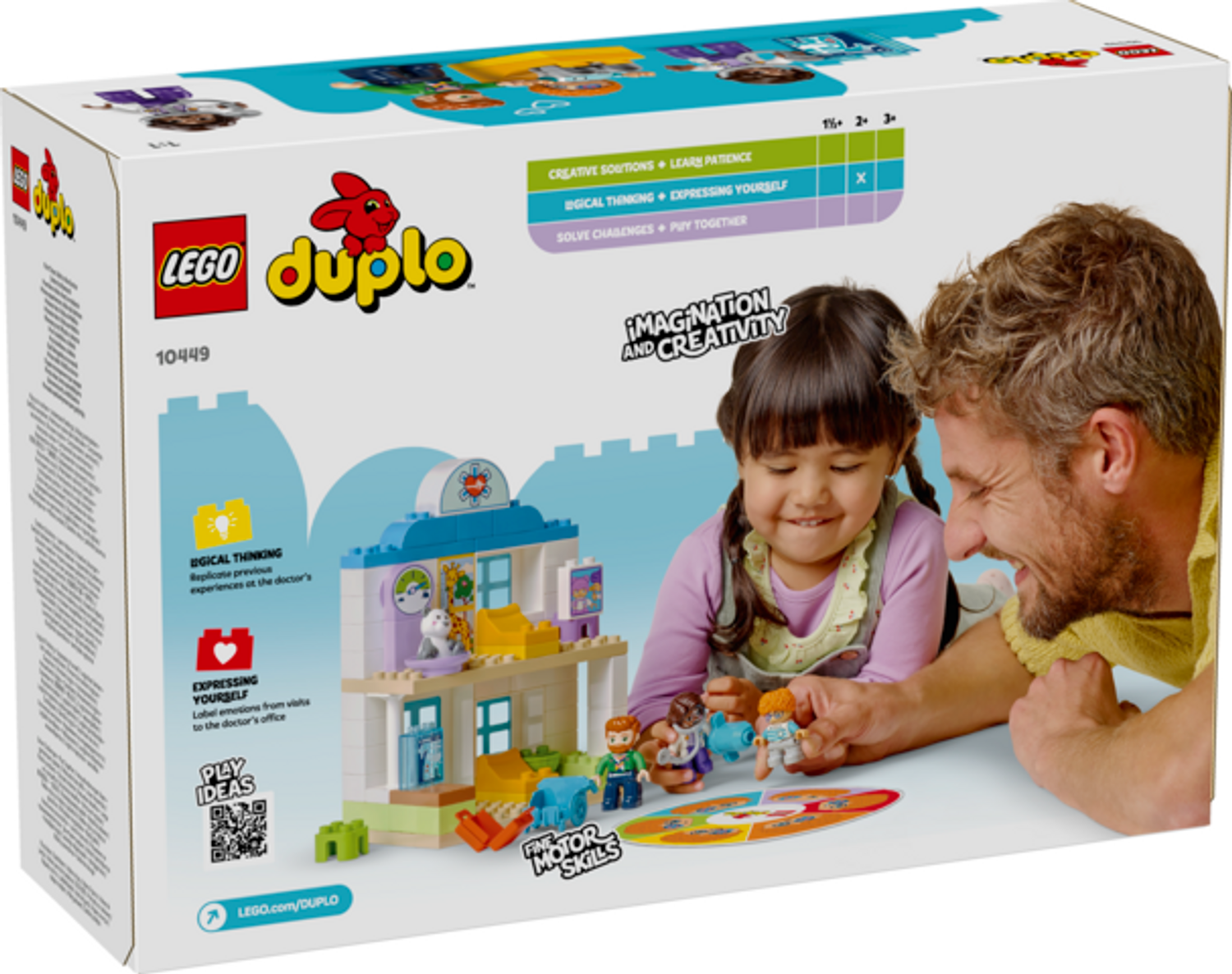 Das LEGO Duplo Spielset 'Erster Arztbesuch' ist perfekt für kleine Bauherren, die ihre ersten Erfahrungen im Spiel mit dem Thema Gesundheit machen möchten. Die 65 enthaltenen LEGO Duplo Steine ermöglichen es den Kindern, kreative Szenarien rund um den Arztbesuch zu erstellen. Mit verschiedenen Figuren, darunter ein kleines Kind und ein Arzt, können sie ihre eigenen Geschichten entwickeln und dabei wichtige soziale und gesundheitliche Themen kennenlernen.