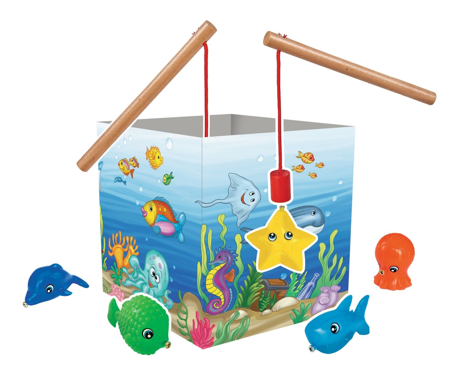 • Enthält ein Papp-Aquarium, zwei magnetische Holz-Angeln und zehn farbenfrohe Plastikfische – ideal für den sofortigen Spielbeginn