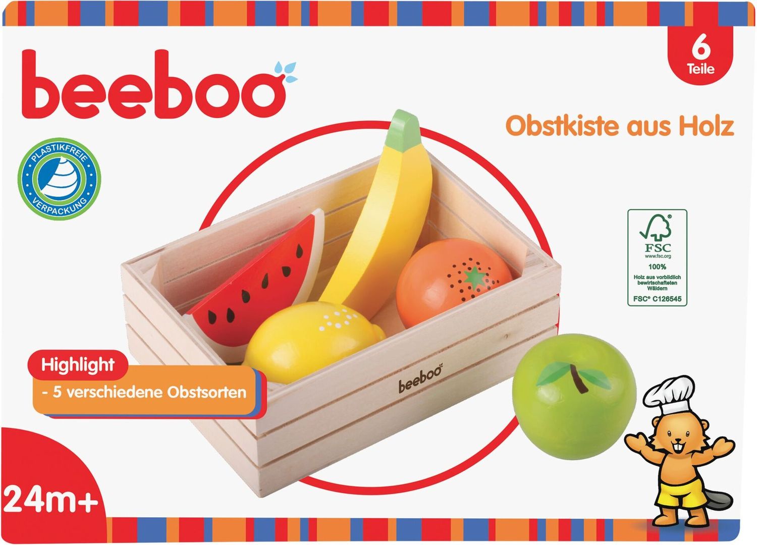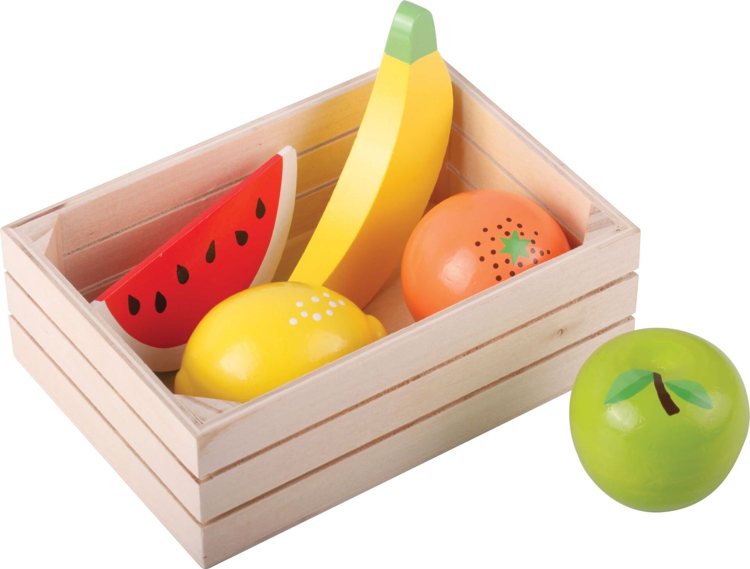 - Kompakte Aufbewahrung: Praktische Holzkiste zur Aufbewahrung der Obstteile und für Ordnung im Spielbereich.