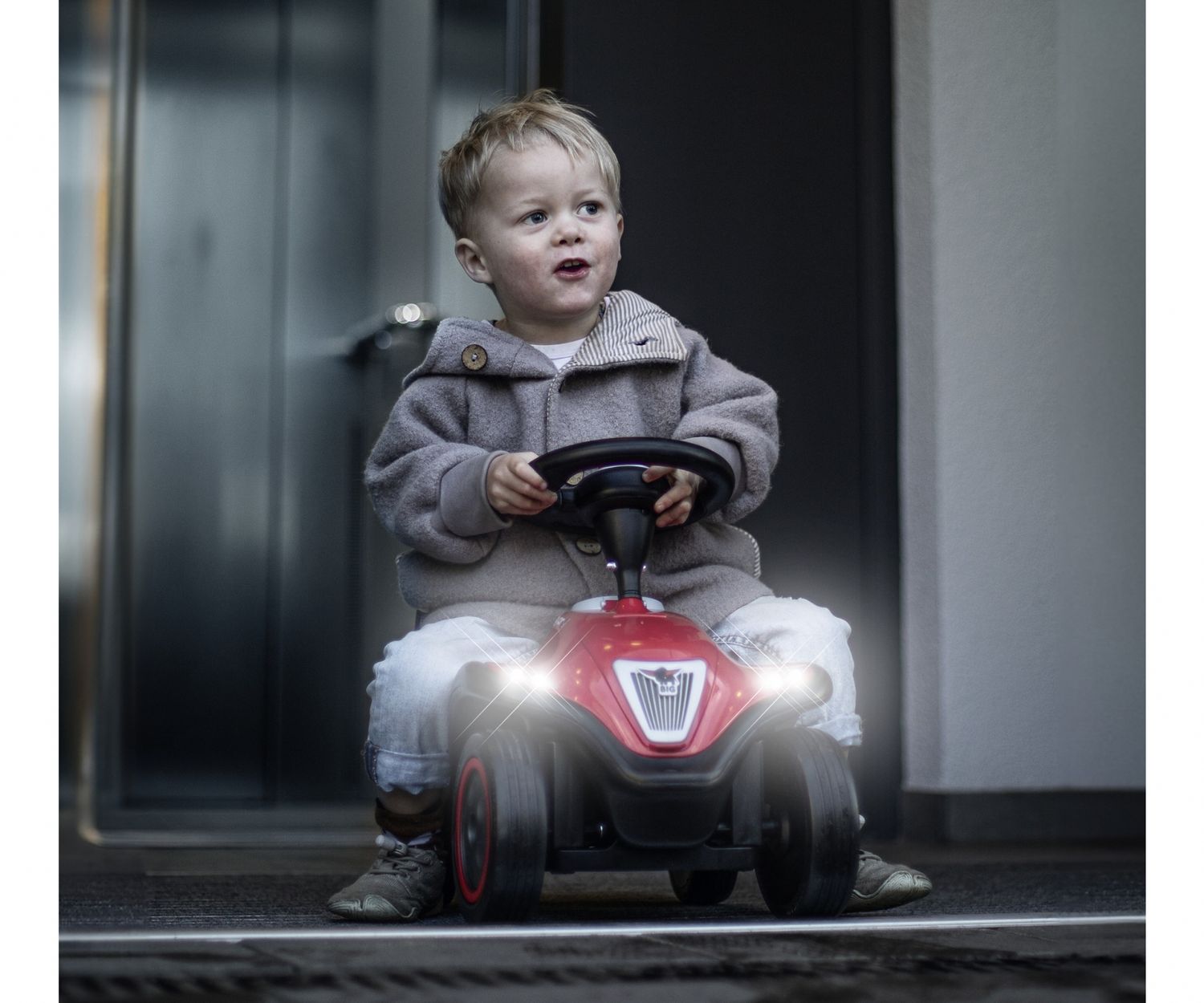 Es beeindruckt nicht nur durch seine farbenfrohe Gestaltung in Rot, sondern bietet auch innovative Features, die das Spielvergnügen maximieren. Neben der klassischen elektronischen Hupe mit zwei verschiedenen Sounds sind die neuen **LED-Doppelscheinwerfer**, **Rücklichter** und **Blinker** für zusätzliches Interesse und Sicherheit verantwortlich. Die Scheinwerfer schalten sich automatisch nach zehn Minuten ab, was die Handhabung weiter erleichtert.