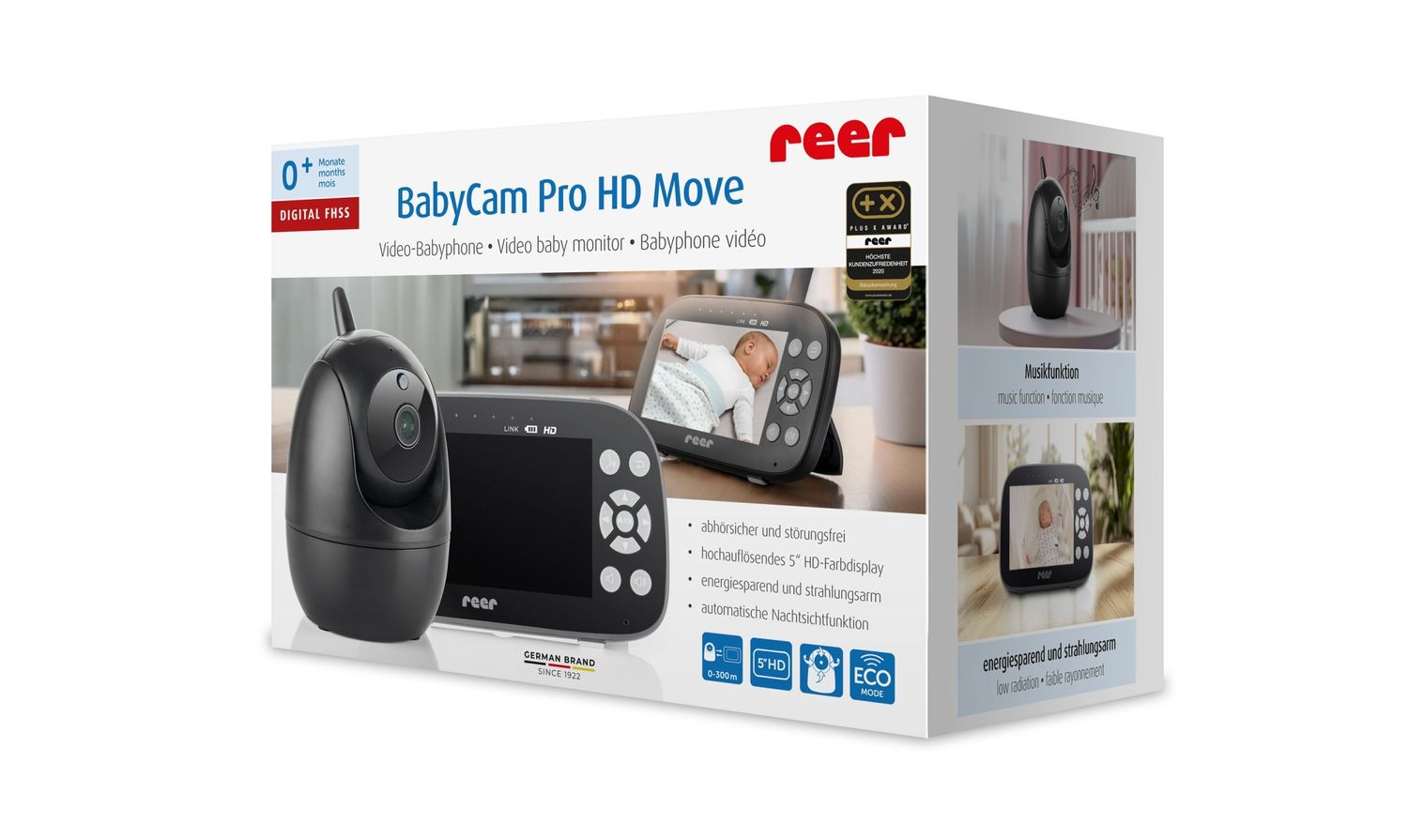 Die reer BabyCam Pro HD Move begleitet Sie mit modernster Technik in jede ruhige Nacht – 5″ HD-Bildschirm, motorisierte Kamera, abhörsichere Übertragung und zahlreiche intelligente Funktionen sorgen dafür, dass Sie Ihr Baby stets im Blick behalten können.