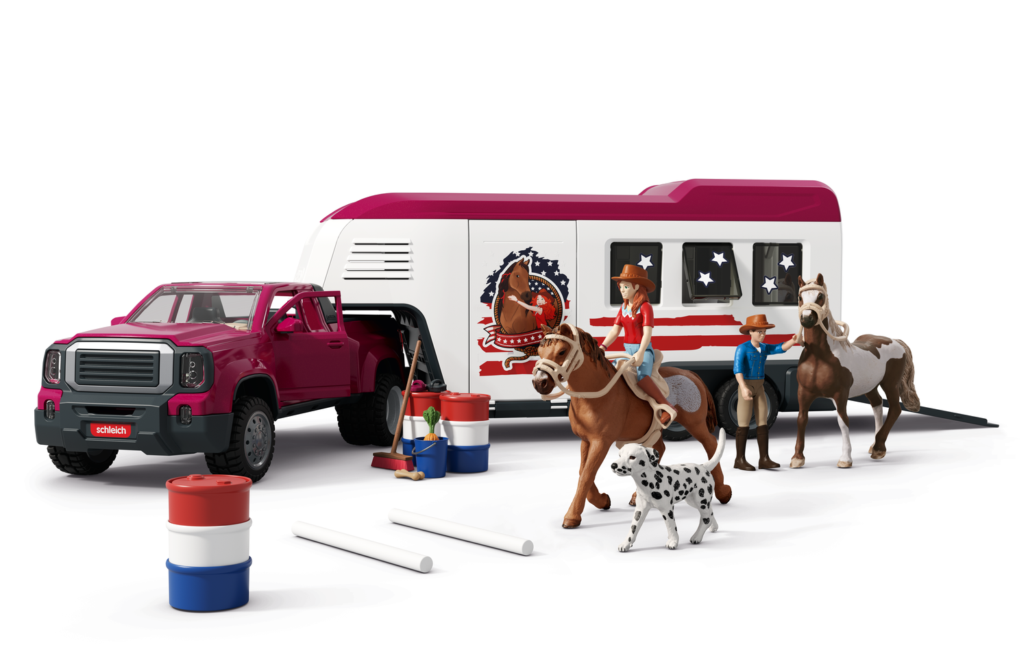 Mit dem „Lakeside Truck and Trailer“ von Schleich Horse Club erleben Pferdefans ab ca. 5 Jahren aufregende Transport- und Westernabenteuer. Der große Pick-Up Truck zieht einen geräumigen Anhänger, in dem Pferde sicher reisen. Komplett mit Hannah und Mr. Kramer als Reiter, zwei Pferden, einem Labrador und umfangreichem Zubehör bietet dieses Set endlose Spielmöglichkeiten – von Trainingseinheiten über unterwegs-Stops bis zum Stallalltag.