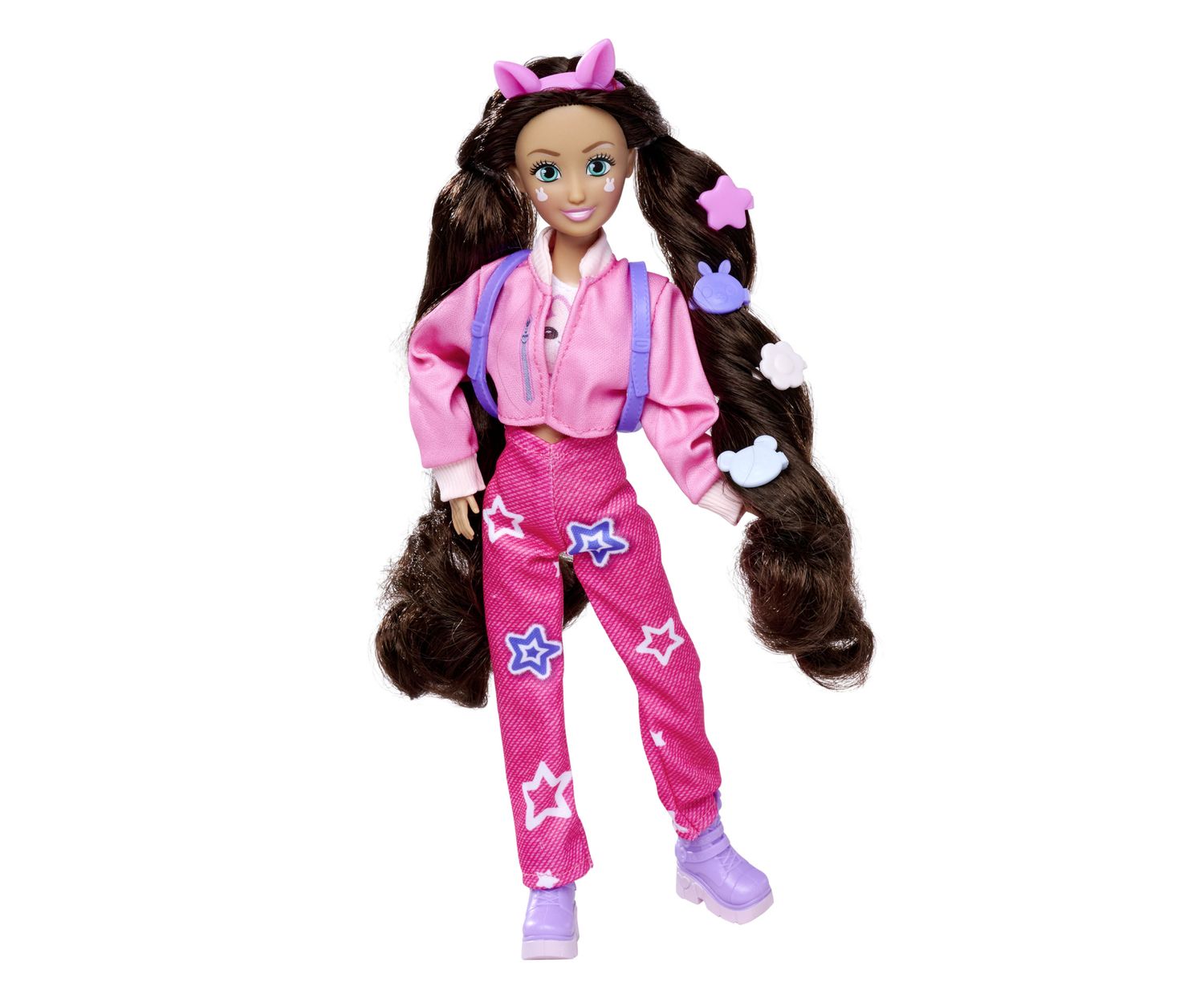 „What’s up? Ich bin Lucy!" Ob geflochten, hochgesteckt oder mit Haarclips geschmückt: Mit ihrem langen, vollen Haar und den bunten Accessoires eignet sich die Frisierpuppe Lucy perfekt für kreative Frisuren und ausgiebige Styling-Sessions! Die voll beweglichen Gelenke sorgen dafür, dass die Spielzeug-Puppe jede Pose einnehmen kann – egal, ob sie sich den Rucksack aufsetzt, ihre Freundinnen begrüßt oder ihren coolen Look präsentiert. Passend zu Häschen Momo, der die modische Fashion-Queen begleitet, ist ihr trendiges Outfit aus Hose, Top und Jäckchen mit verspielten Motiven verziert. Ein zauberhaftes Geschenk für Kinder, die Spaß an Mode und Hairstyling haben!