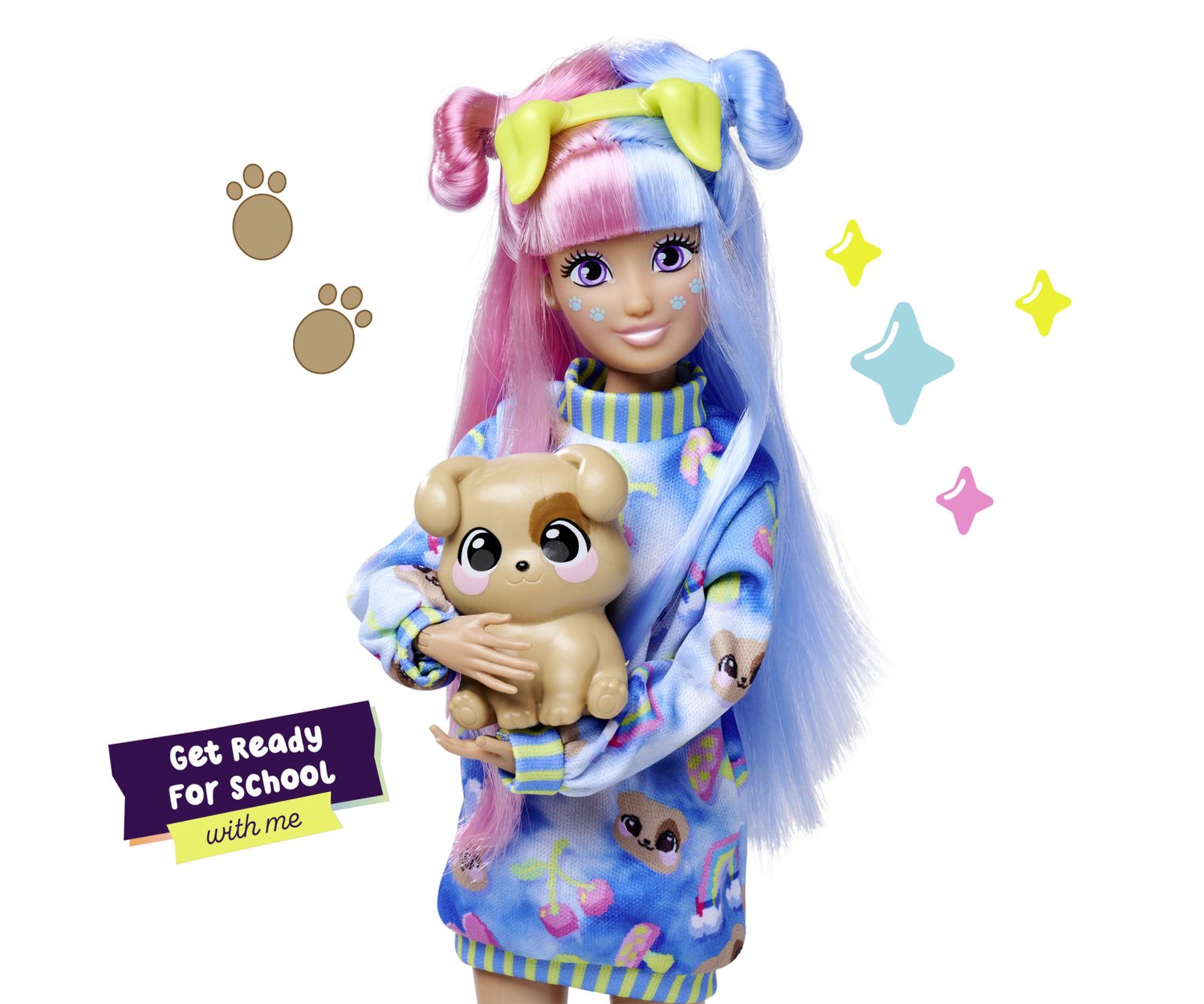 „Hi Sweeties, ich bin Mia!" Mit ihrem zweifarbigen Haar und einem super-coolen Look setzt Modepuppe Mia neue Trends und liebt es, kreative Outfits auszuprobieren. Als voll bewegliche Spielzeug-Puppe kann Mia verschiedenste Posen einnehmen und ist bereit für jedes Fashion-Abenteuer. Immer mit dabei: ihr süßer Hund Choco! Mias lange, weiche Haare laden zum Frisieren und Stylen ein – dank Haarreif und bunten Haarclips entstehen laufend neue Frisuren. Zusätzlich enthält das Set weiteres Zubehör, wie Schuhe, Kamm oder Rucksack, das für abwechslungsreiche Styling- und Spiel-Ideen sorgt. Ob Kämmen, Ankleiden oder Umstylen– Frisierpuppe Mia ist die perfekte Begleiterin für kleine Fashion-Fans, die Mode und Haarstyling lieben.