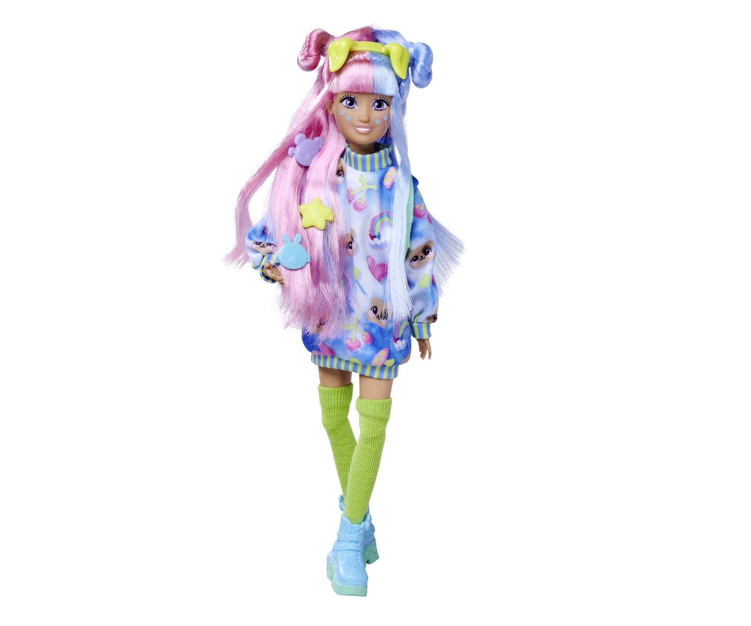• Trendige Styling-Puppe - „Hi Sweeties, ich bin Mia!" Die bewegliche Ankleidepuppe trägt ein angesagtes Pulli-Kleid und rosa-blaues Haar, das sich fabelhaft kämmen, frisieren und stylen lässt!