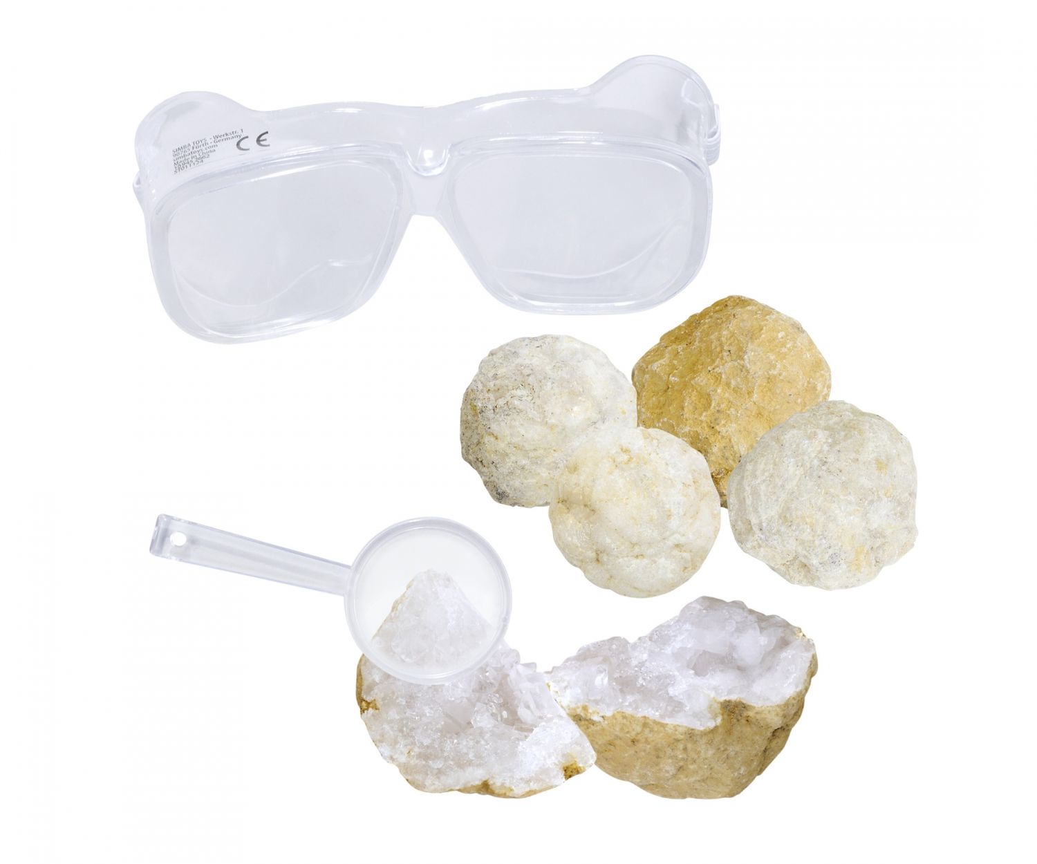 • Besondere Fundstücke im Inneren – Jede Geode birgt einzigartige Kristalle, die sich beim Öffnen offenbaren. Mit den enthaltenen Gegenständen wie der Schutzbrille und einer Lupe wird die Entdeckerfreude weiter angeregt und fasziniert.