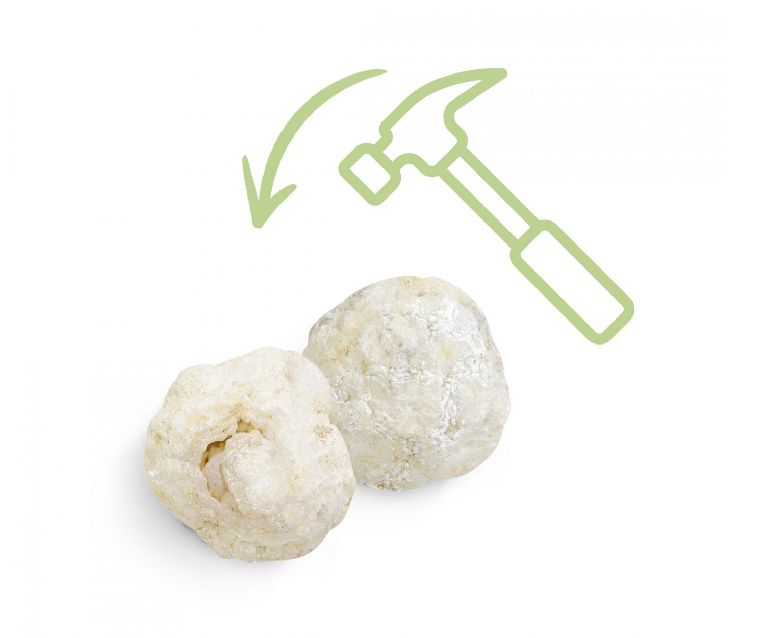 • Entdecke faszinierende Geoden – Fünf echte Geoden, jeweils 3–4 cm groß, warten darauf, geöffnet zu werden. Ein spannendes Abenteuer für alle, die die Geheimnisse der Mineralienwelt erkunden möchten.
