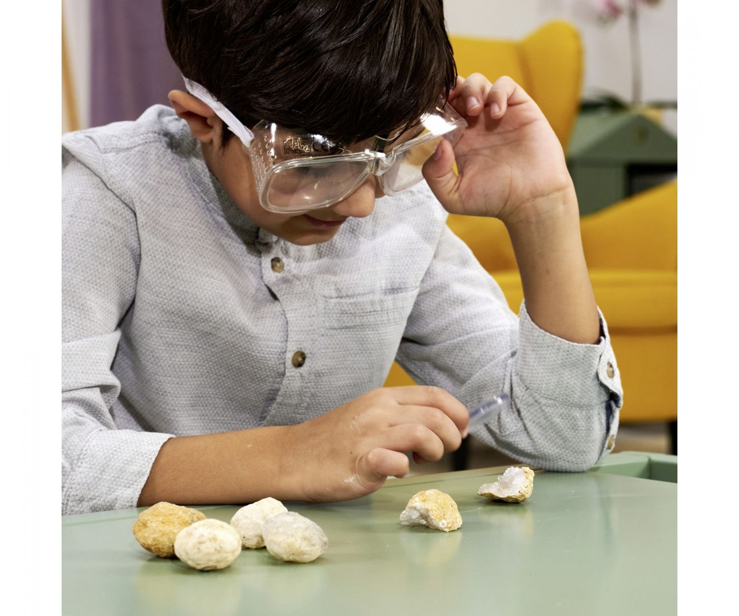 Sind die Geoden erst einmal geöffnet, können die Mädchen und Jungen mit der beiliegenden Lupe selbst feinste Kristalle im Detail bestaunen. Denn jede Geode ist ein einzigartiges Naturphänomen, das nur darauf wartet, von den Kids entdeckt und erforscht zu werden. Perfekt für kleine Geologie- und Archäologie-Fans, die die faszinierende Welt der Steine und Kristalle hautnah erleben möchten: Das Spielzeug-Set fördert Neugier, Motorik und den Entdeckergeist – und bringt den Kindern spielerisch die Geheimnisse unserer Erde und Natur näher.
