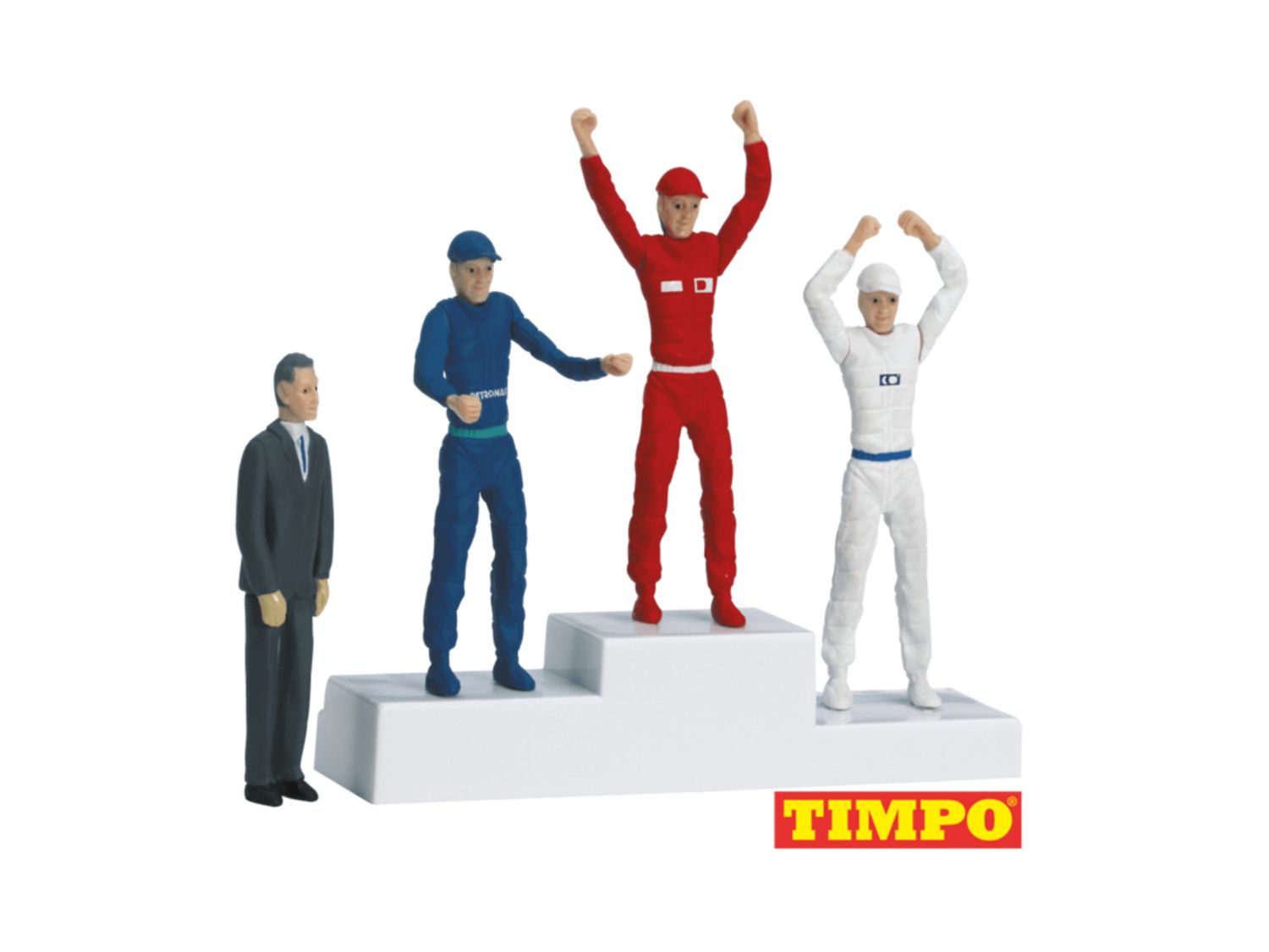 TIMPO Figurensatz und SiegerpodestDIGITAL 124, DIGITAL 132 und EVOLUTIONGeeignet als Dekoration für die Rennbahn Sieger gebührend feiern Mit dem Siegerpodest und den dazugehörigen Figuren erweiterst Du Deine Carrera Bahn um ein wichtiges Detail. Ein Siegerpodest ist unverzichtbar für je des Rennen und sollte deshalb auch auf Deiner eigenen Rennbahn nicht fehlen. Der Figurensatz besteht aus einem Siegerpodest, drei Gewinnern sowie einem Offiziellen. Die Figuren sind coloriert und sehr detailgetreu verarbeitet. Damit ist echte Detailtreue garantiert und man ist von den kleinen Figure n durchaus begeistert. Ihre Körperteile lassen sich verschieden positionieren bzw. drehen. Die Figur en ergänzen das Podest und hauchen der Bahn ein Stück Leben ein. Wer kann wohl die meisten Rennen fü r sich entscheiden und das Siegertreppchen für sich reservieren?