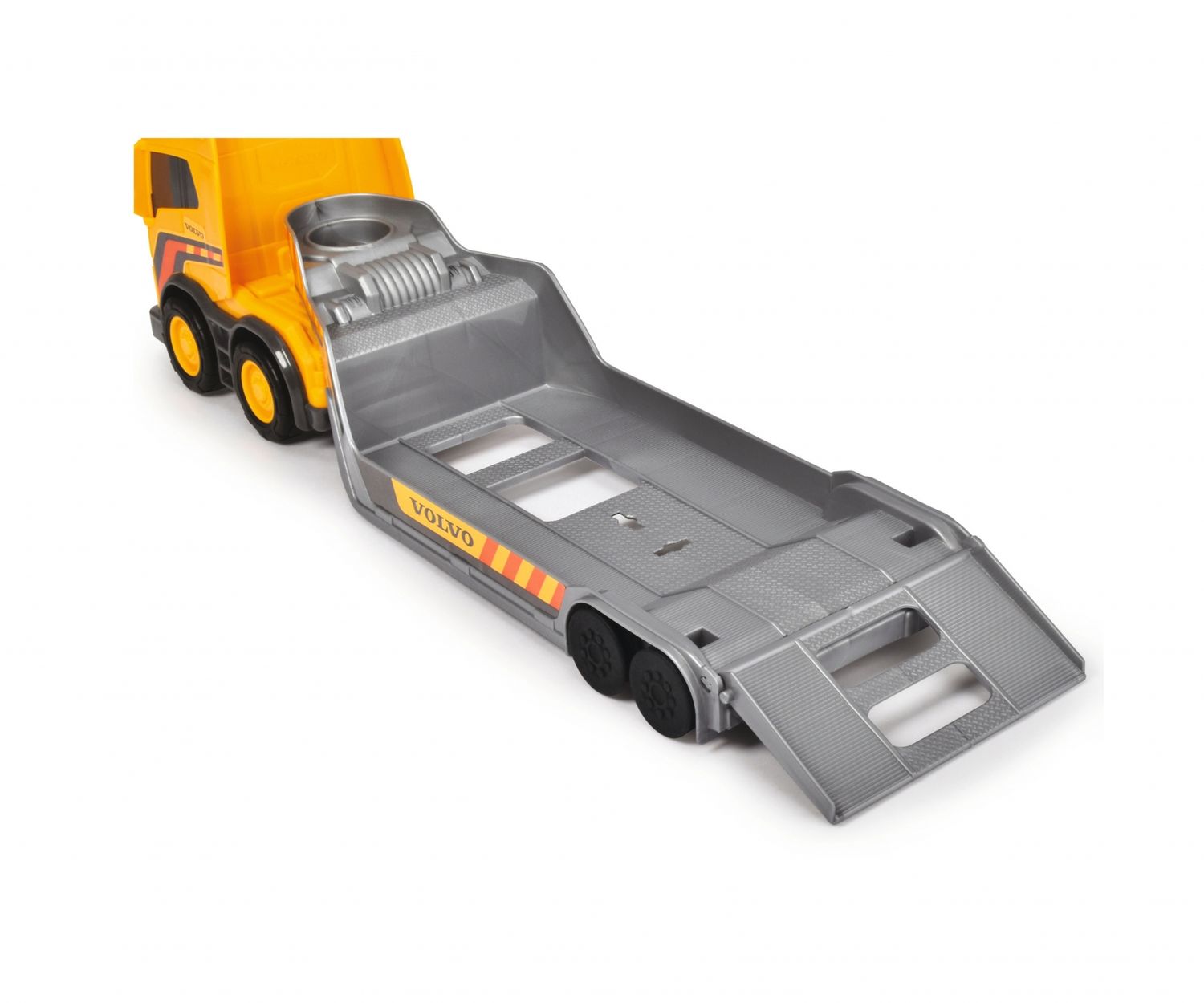Der 32 cm lange Lastwagen bringt auf seinem Tieflader einen echten Volvo Radlader (9 cm). Durch seinen Freilauf ist er leicht zu bewegen und kommt sicher an der Baustelle an. Seine Schaufel lässt sich per Knopfdruck kinderleicht auf und ab bewegen - so geht keine Ladung verloren. An der Baustelle angekommen wird die Schaufel nur noch gekippt und im nu können Ihre fleißigen Bauarbeiter riesige Fantasieberge anhäufen.