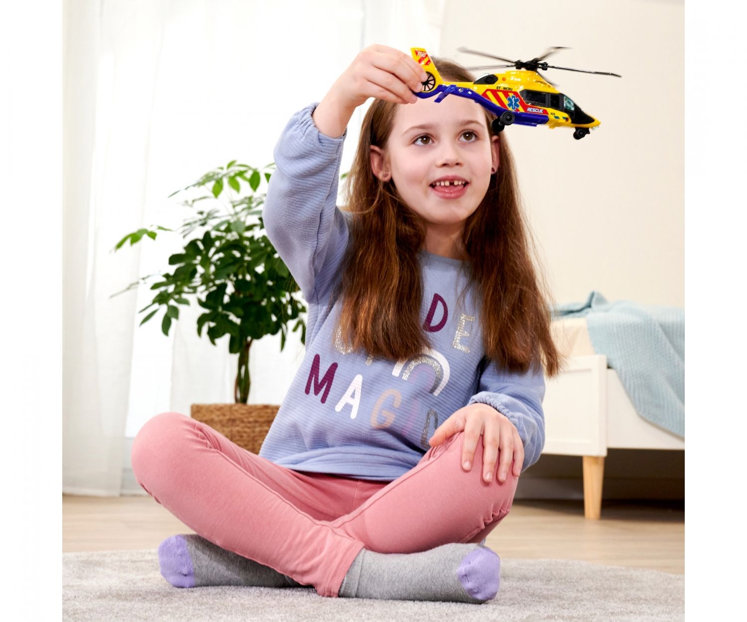 Dank seiner strahlend gelben Farbe ist der offiziell lizenzierte Airbus H160 Rettungshubschrauber (23 cm) auch bei schlechten Witterungsbedingungen gut zu sehen und ist für Mädchen und Jungen ein echter Blickfang. Wenn die Kinder ihn nicht gerade mit rotierendem Propeller durch die Luft wirbeln, rollen sie ihn auf den leicht gängigen Rädern per Freilauf über den Kinderzimmer-Boden.
