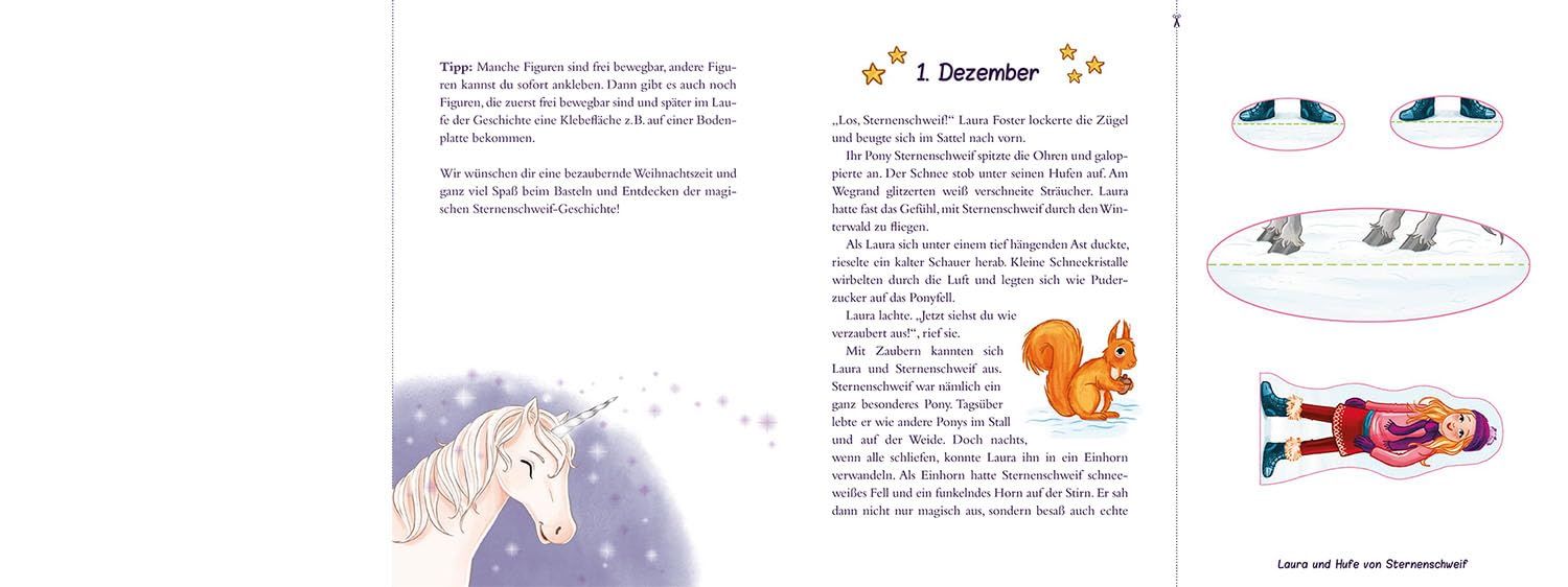 Der Sternenschweif – Weihnachten im Einhornland ist mehr als ein Buch: Es ist ein interaktiver Adventskalender mit 24 Türchen der besonderen Art. Jeden Tag erwartet die Kinder ein neues Kapitel der Freundschaft zwischen Laura und ihrem Einhorn Sternenschweif sowie zwei Bastelelemente zum Ausschneiden und Falten. Schritt für Schritt entsteht bis Weihnachten ein kleines Einhorn-Diorama, in dem bezaubernde Szenen Gestalt annehmen.