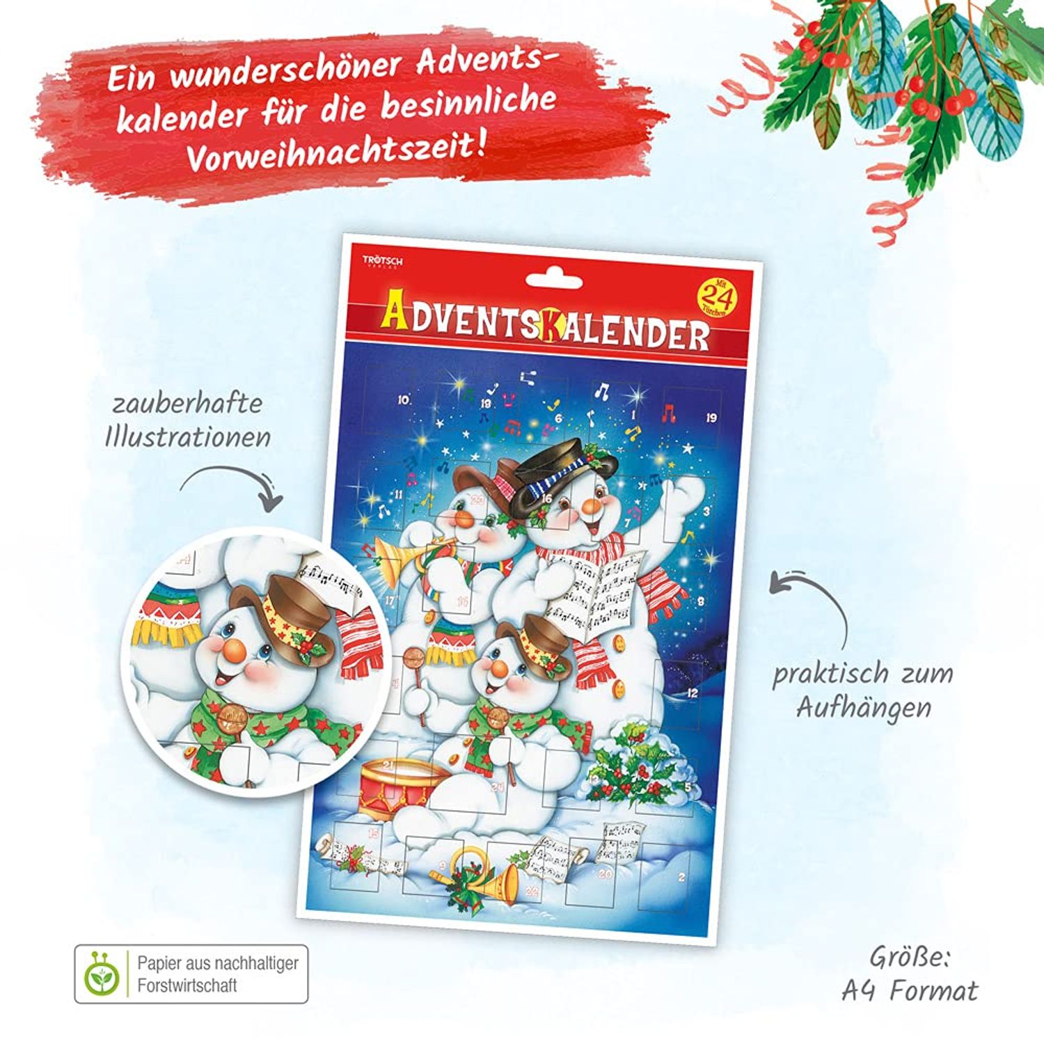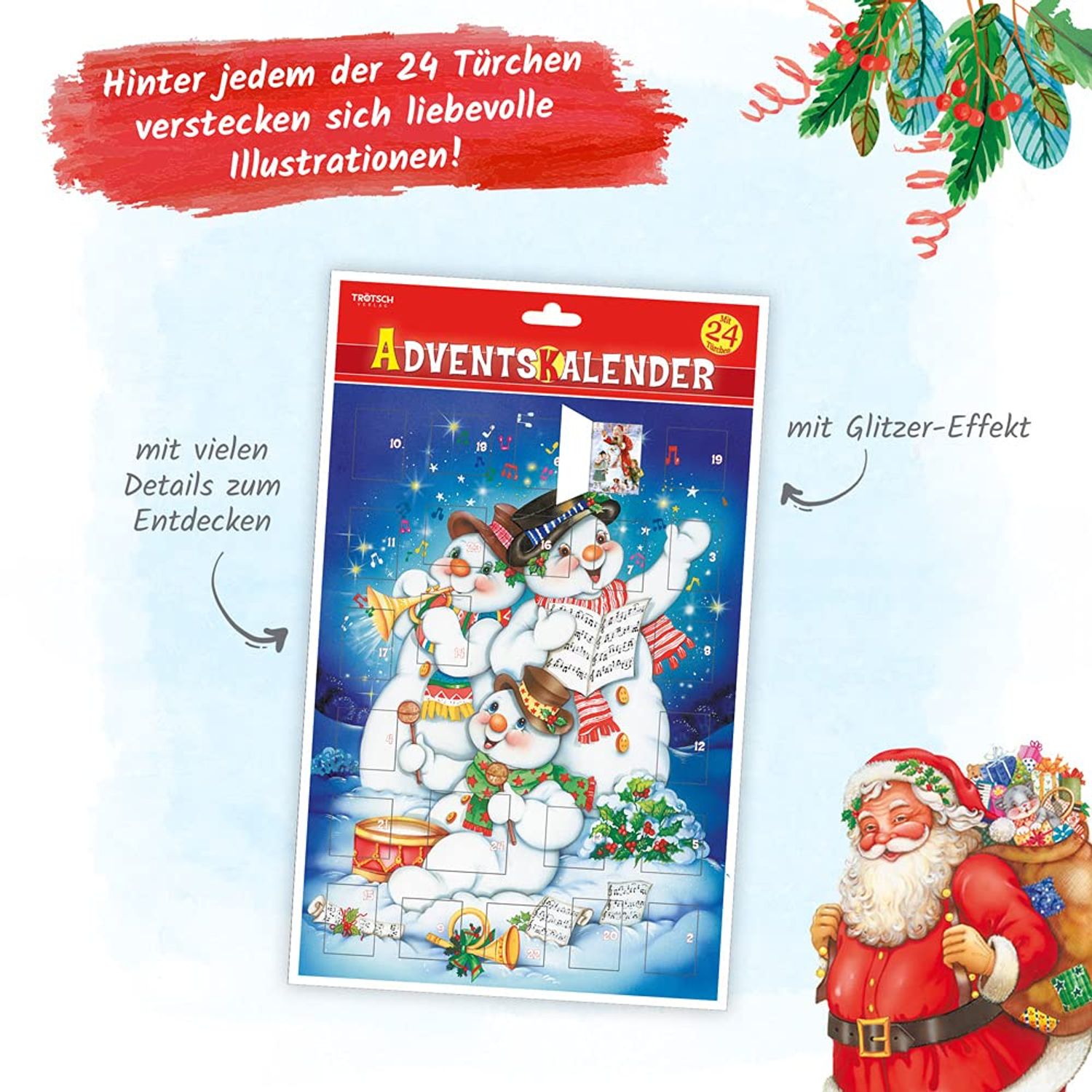 Mit dem Trötsch Adventskalender Schneemann-Kapelle beginnt eine liebevolle und einfache Adventszeit voller stimmungsvoller Motive! Hinter jedem der 24 Türchen befindet sich eine winterliche Illustration – ideal für kleine Kinder oder als dekoratives Element für Zuhause.